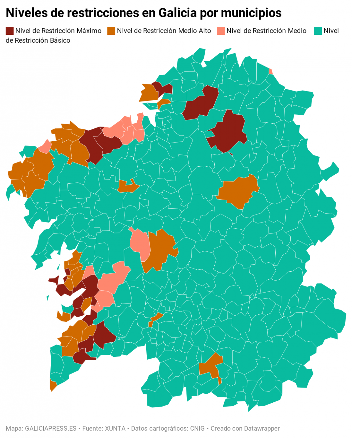 La xunta de galicia ha definido varios grupos de municipios o perímetros que estarán sujetos a estas normas sobre el resto de zonas situadas fuera de las áreas de máximas restricciones restricciones. Para esto, el comité asesor ha aprobado un sistema de restricciones por niveles, ligado a la situación epidemiológica de cada municipio.
